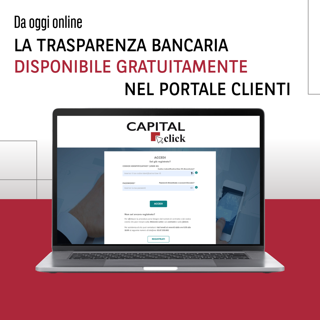 In linea con il nostro impegno per la sostenibilità e la riduzione dell’impatto ambientale, informiamo tutti i Clienti che la Comunicazione Periodica di Trasparenza Bancaria relativa ai contratti è disponibile gratuitamente nel Portale Clienti: https://capitalclick.fineasy.com/, sezione “I MIEI DOCUMENTI”, “COMUNICAZIONE PERIODICA DI TRASPARENZA”.